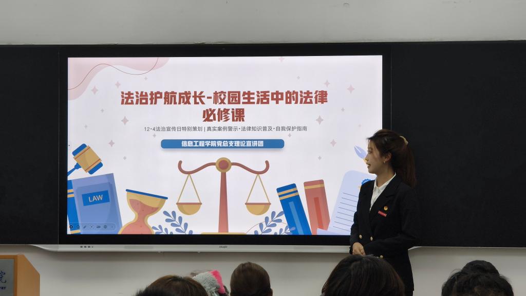 为帮助同学们树立正确的法治观念,明确成长道路上的法律边界,本月信息工程学院党总支理论宣讲团成员充分利用晚自习时间为25级学生开展了“法治护航成长——校园法律中的必修课”主题宣讲活动。