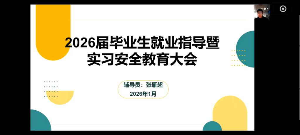 为扎实推进2026届毕业生实习就业工作,增强学生安全意识,保障实习就业环节顺利开展,信息工程学院开展了2026届毕业生就业指导暨实习安全教育大会,大会由2026届专职辅导员潘楚琦、张雁超主讲。